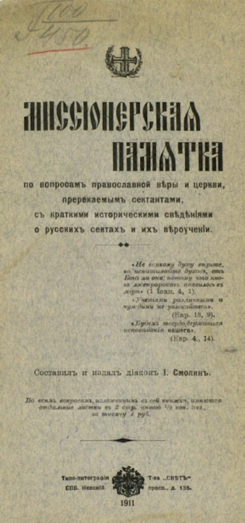 [3] Буткевич Т. И. Обзор русских сект и их толков с изложением их происхождения, распространения и вероучения и с опровержением последнего. Пг.: Издание В.Л.Тузова, 1915; Бондарь С. Д. Адвентизм 7-го дня. СПб.: тип. М-ва вн. дел, 1911; Смолин И. В. Миссионерская памятка по вопросам православной веры и церкви, пререкаемым сектантами, с краткими историческими сведениями о русских сектах и их вероучении. СПб.: Типпо-лит. Т-ва «Свет», 1911; Смолин И. В. Меч духовный в ограждение от сектантских лжеучений. СПБ.: Типо-лит. “Свет”, 1910; Смолин И. Краткие исторические сведения о русских сектах и их вероучении. СПб.: Типпо-лит. Т-ва «Свет», 1911; Кальнев М. Адвентизм и иоаннитство пред судом миссионерской критики // Миссионерское обозрение. 1910. № 1. С. 1-34; Восторгов И. Вражеский духовный авангард. «Немецкая вера». К вопросу о сущности русского сектантства. М.: Рус. печ., 1914; Кушнев И. А. Немецкие веры. Орел: Электрич. тип. А.А. Логунова, 1916; Айвазов И. Г. Беседы с адвентистами седьмого — субботнего дня о субботе и воскресном дне // Миссионерское обозрение, 1904. № 6. С. 12-14; Боголюбов Д. И. Кто это пашковцы, баптисты и адвентисты? При свете Слова Божия и перед судом церковной истории. С-Пб.: Отечественная типография, 1912; и т.д.